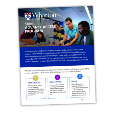 The Moelis Advance Access Program is a deferred enrollment program that offers students in their final year of undergraduate and full-time graduate degree programs a guaranteed pathway to the Wharton MBA. After admission, admitted students pursue two to four years of quality work experience before matriculating in the full-time MBA program.